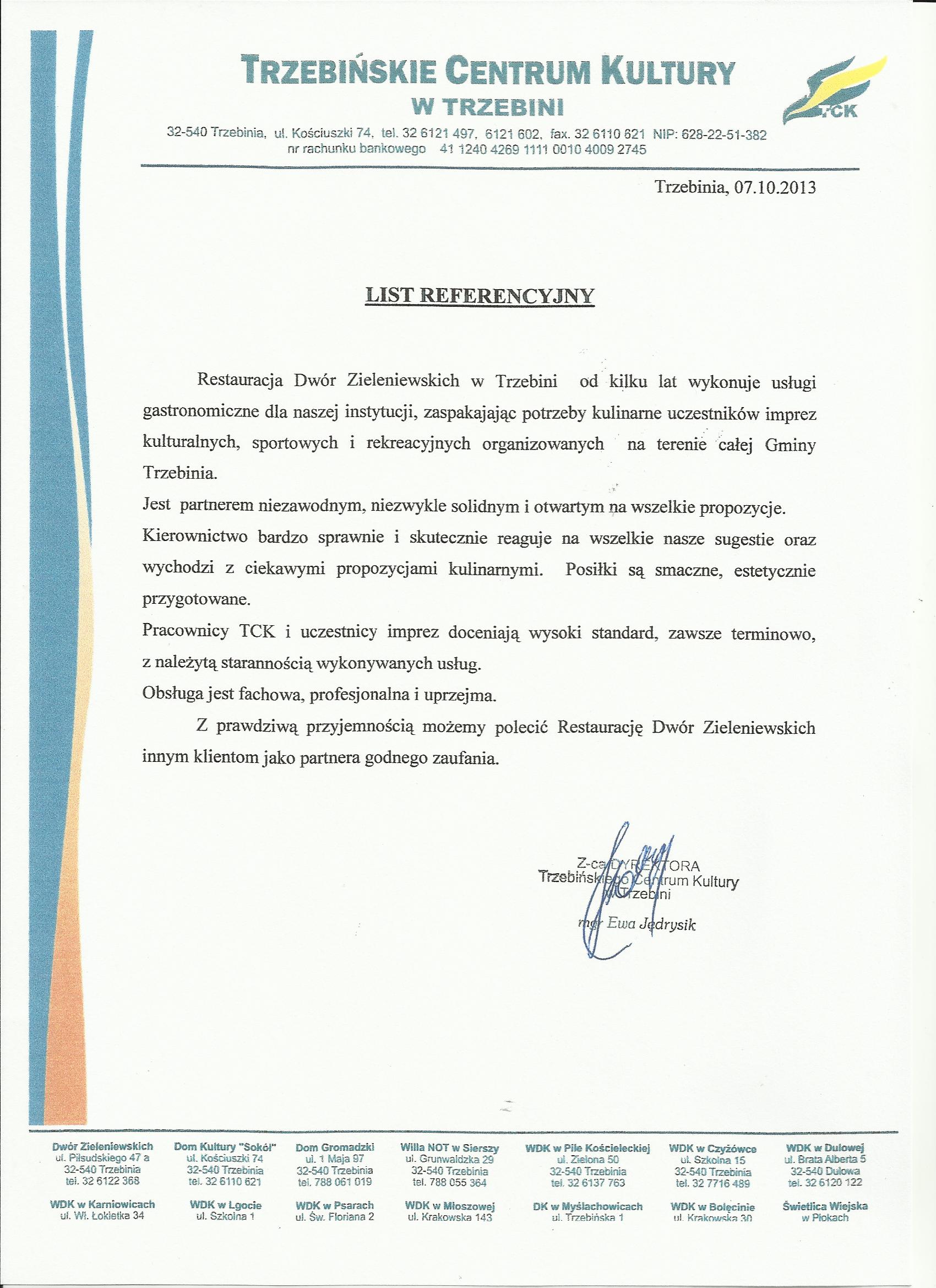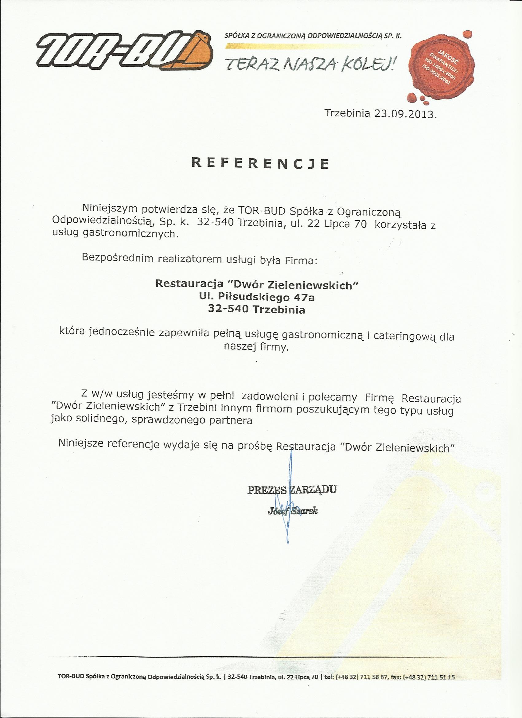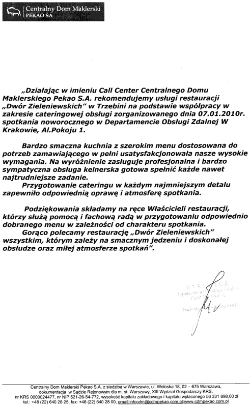 W 2003 roku, postanowiliśmy ubiegać się o możliwość poprowadzenia restauracji w urokliwym miejscu - Dwór Zieleniewskich. Jako, że nasza filozofia działania - jakość, elegancja, elastyczność dobrze wpisywała się w kulturę tego pięknego obiektu, z powodzeniem otworzyliśmy przytulną restaurację w piwnicach dworu.
